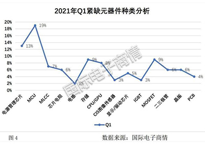 2021 m. pirmąjį ketvirtį TOP5 komponentų kategorijos, kurių pirmąjį ketvirtį trūksta, yra: MCU (19 %), maitinimo valdymo lustas (13 %), MOSFET (9 %), saugykla (9 %), CPU / GPU. (8 proc.).
